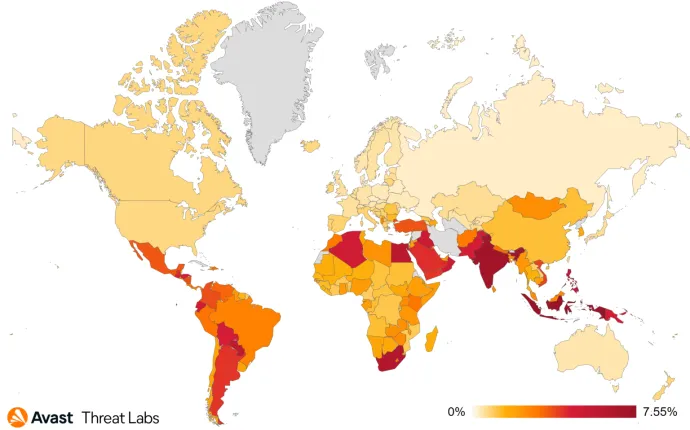 The global risk ratio of adware in Q4 2023 was similar to the previous quartile. Nevertheless, the prevalence of desktop adware remains significantly elevated. The most affected regions remain South America, Africa, Southeast Asia, and Southeast Europe, as the map below illustrates