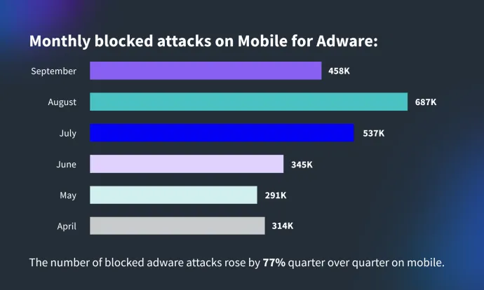 Adware shifted from desktop to mobile this quarter. After last quarter’s desktop spike and the return of Dealply, we saw a clear increase on Android. The number of blocked adware attacks rose by 77% quarter over quarter on mobile, driven mainly by HiddenAds-style apps that use obfuscation and hide after install, often posing as simple games. A notable share came through the official Google Play Store, which helps explain the growth, since people trust the store and many devices still run without active protection.