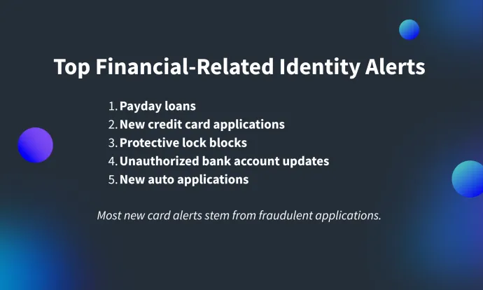 On the transaction side, alerts are led by suspicious bank-account activity (42%) and credit card activity (20%). Smaller but notable shares include gray charges -small, technically authorized recurring fees like trial rollovers and add-on “clubs”- (9%), unusual charges (8%), and login errors at financial institutions (7%). The pattern reflects a familiar playbook: move fast to turn access into cash, then test the limits of existing accounts.