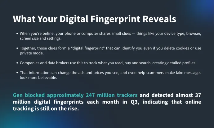 Our telemetry shows that since July 2025 we have blocked an average of 247 million trackers per month, and we are seeing almost 37 million digital fingerprints per month, a 1% quarter-over-quarter increase. This tells us that tracking is alive and growing. Fingerprinting keeps you identifiable even without cookies, letting companies and data brokers stitch together a detailed record of what you read, buy, and search. That profile can shape the prices you see, fuel relentless targeting, and give scammers enough detail to make fake messages feel real.
