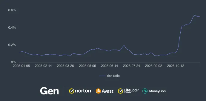 Throughout most of 2025, the share of users running into fake shop scams stayed relatively low. From late spring, it started to creep up, then shot up sharply in October as holiday campaigns kicked in. The chart below shows this “risk ratio”, that is, the percentage of active users who have been protected from fake shops on any given day.