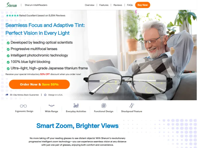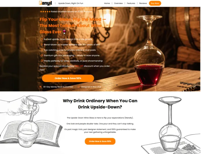 We also saw multiple "single product" fake shops that look almost identical. One example promoted "intelligent reading glasses" with bold claims about advanced optics and a big 50 percent discount. Another pushed a "designer wine glass" using the same layout, the same type of trust badges, and nearly the same urgency-driven messages.