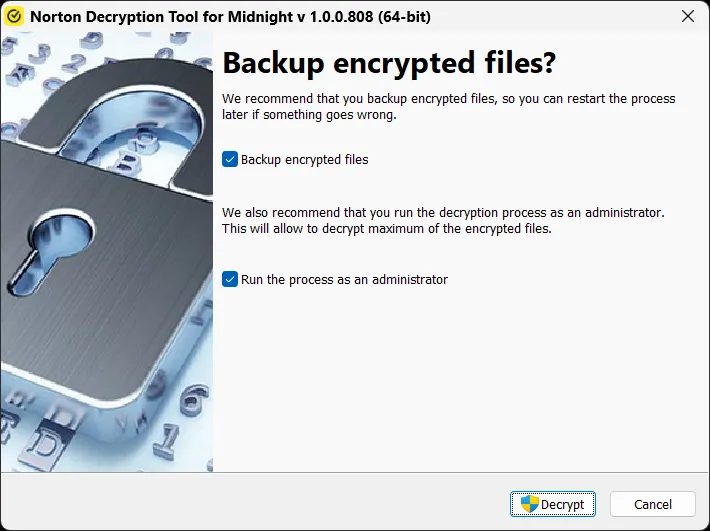 5. On the final page, you can opt-in to back up your encrypted files. These backups may help if anything goes wrong during the decryption process. This option is selected by default, which we recommend. After clicking Decrypt, the decryption process begins. Let the decryptor work and wait until it finishes decrypting all of your files.