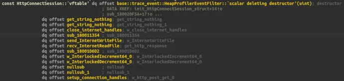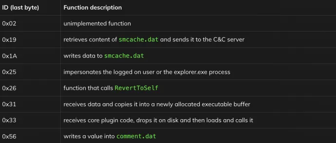 Next, the malware collects information about the infected environment (such as username, DNS and NetBios computer names as well as OS version and architecture) and sets up its internal structures, most notably a list of “call objects”. Call objects are structures each associated with a particular function and saved into a “dispatcher” structure in a map with hard-coded 4-byte keys. These keys are later used to call the functions based on commands from C&C servers.
