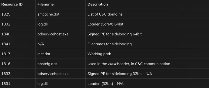The encryption key is a wide string starting from offset 0x8. The encrypted data starts at the offset 0x528. To decrypt the data, a SHA256 hash of the key is created using CryptHashData API, and is then used with a hard-coded IV 0123456789abcde to decrypt the data using CryptDecrypt API with the AES256 algorithm. After that, the decrypted data is decompressed with RtlDecompressBuffer. To verify that the decryption went well, the CRC32 of the data is computed and compared to the value at the offset 0x4 of the original resource data. When all the payloads are dropped to the disk, bdservicehost.exe is executed to run the next stage.
