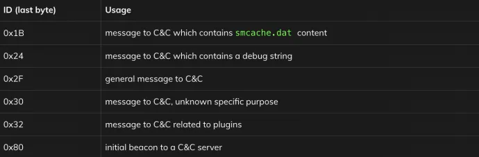 Each message sent to the C&C server contains a hard-coded four byte number value with the same structure as the values used as keys in the call-object map. The ID numbers associated with messages sent to C&C servers that we’ve seen are: