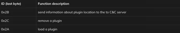 This plugin is a DLL binary loaded by the fileless core module (Proto8) as mentioned above. It extends the malware’s functionality by adding methods for managing additional plugins. These additional plugins export the function "GetPlugin" which the core plugin executes.