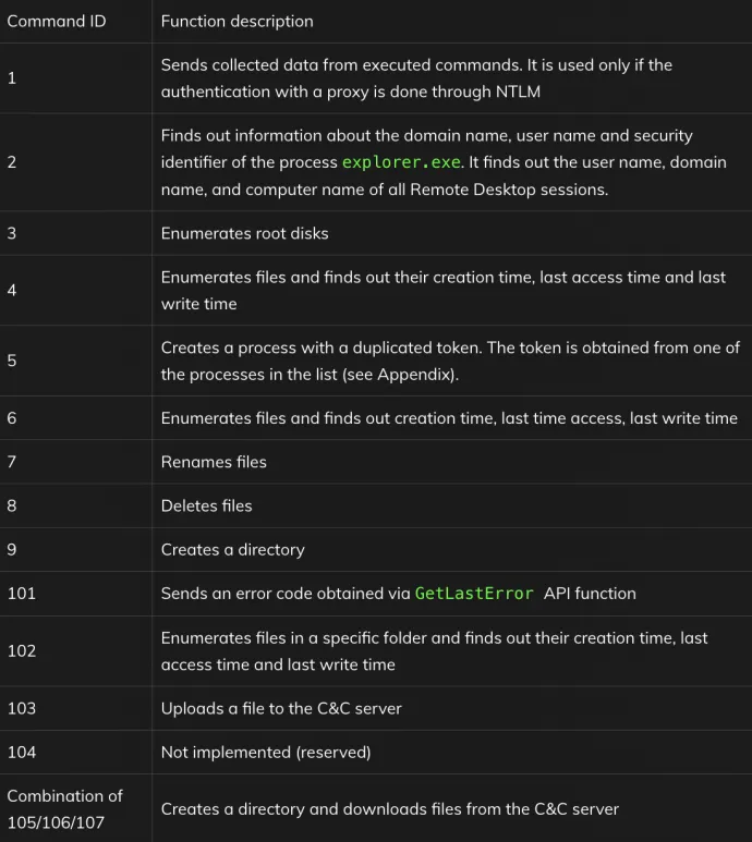 Overall, the core module code is quite robust and contains many failsafes and options for different scenarios (for example, the amount of possible protocols used for C&C communication), however, we probably only saw samples of this malware that are still in active development as there are many functions that are not yet implemented and only serve as placeholders.