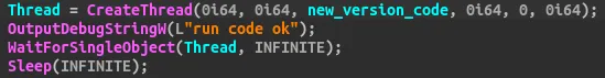 The malware first looks for a file called new_version.dat – if it exists, its content is loaded into memory, executed in a new thread and a debug string “run code ok” is printed out. We did not come across this file, but based on its name and context, this is most likely a self update functionality.