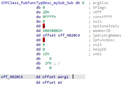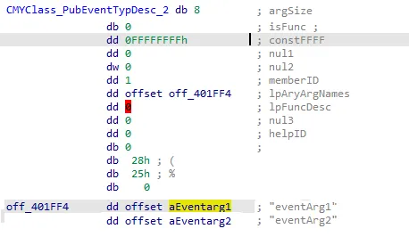 This structure closely follows the layout of the PubFuncDesc type. One thing to note, however, is that I have not currently been able to locate a link to the Event name strings embedded within the compiled binaries.