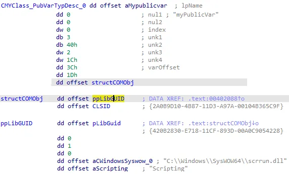 If the comobj type is encountered, an offset to another structure will be found that specifies the objects library guid, clsid, library name, and dll path. We will show this structure later when we cover public variables.