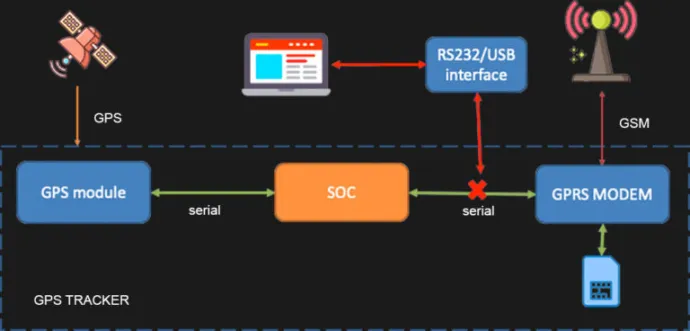 Usually, the tracker itself is a simple, inexpensive devices that carries a SOC (system on chip) module as the main component; a serial bus connects the SOC to a GPS module that provides a location as well as to a GPRS modem that connects to a SIM card which provides DATA+SMS capabilities to the device. Very often, you can also find a microphone and a speaker for phone functionality that is used when the “SOS” button is pressed.