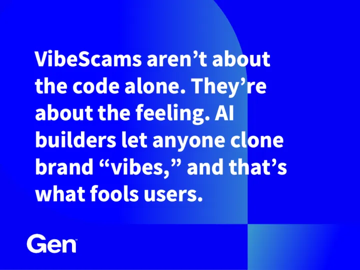 We call them VibeScams because the trick isn’t in the code alone — it’s in the feeling. These pages pass the “vibe check”: the right colors, spacing, logo placement, and tiny footer links people trust at a glance. Because AI web builders can recreate that look from a single prompt or screenshot, attackers don’t need coding skills — they only need to get the vibe right. That’s enough to trick people into handing over credentials or cash, and it’s why this wave of scams spreads so fast.